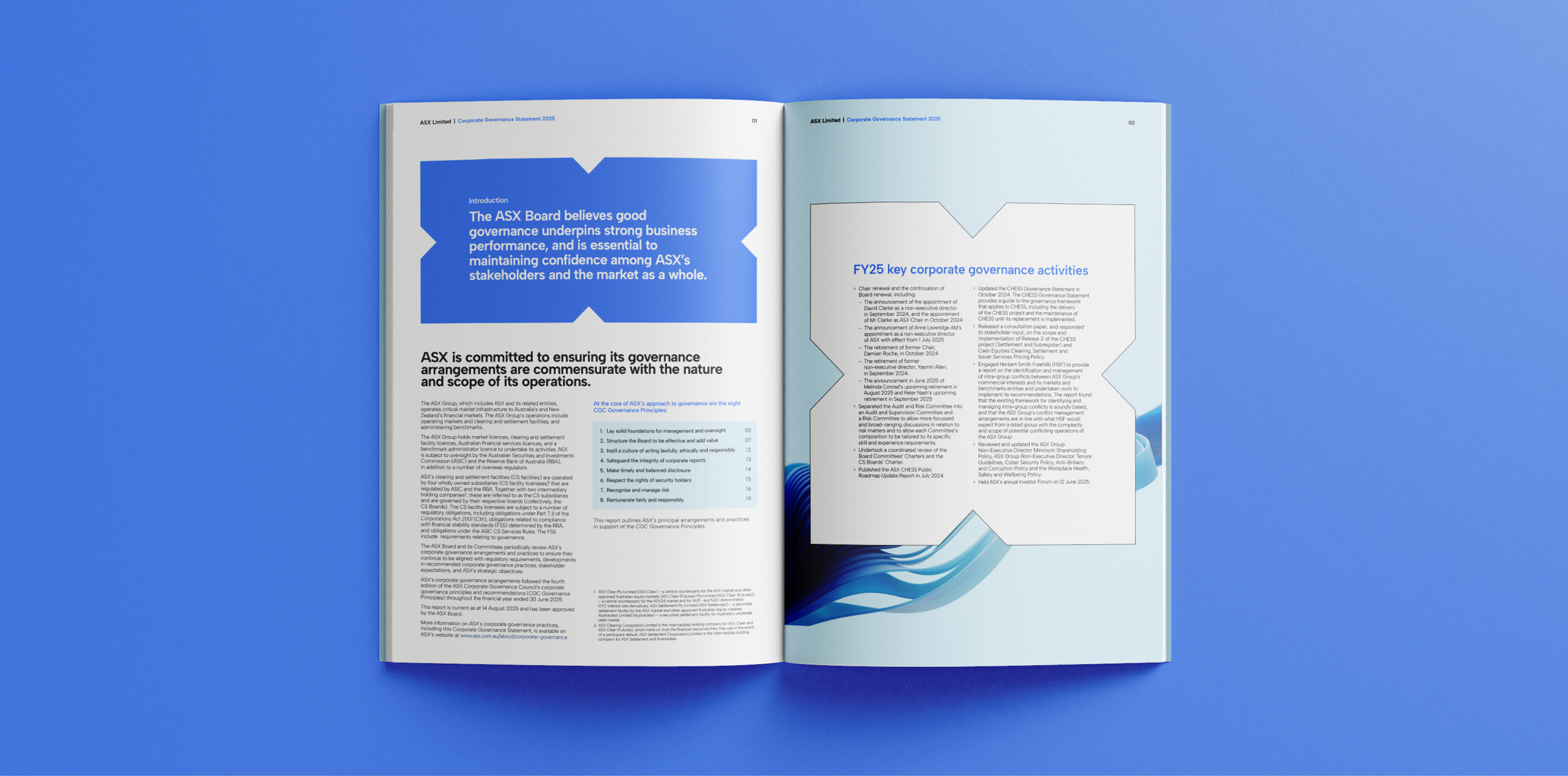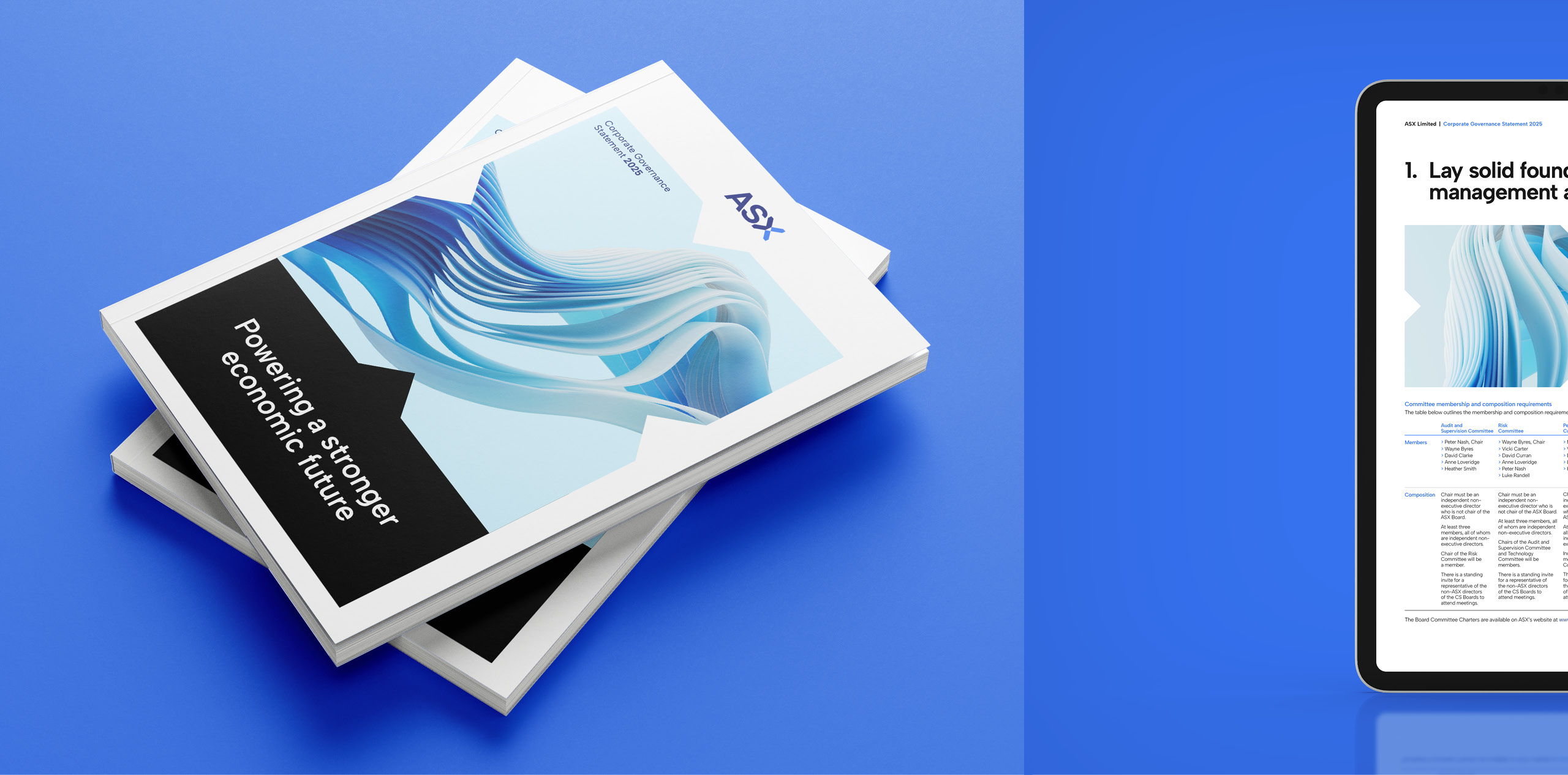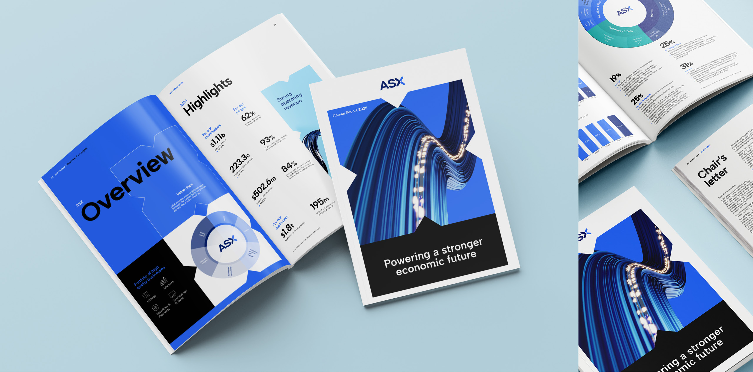 The 2025 Annual Reporting Suite was among the first opportunities to showcase ASX’s refreshed brand, launched only weeks earlier. Introducing the new identity across a flagship corporate document set a clear benchmark for consistency and impact. Our collaboration with ASX focused on leveraging the Workiva platform to deliver a seamless, highly collaborative reporting process. By working closely with their team, we ensured the brand was applied with precision and clarity, reinforcing ASX’s forward momentum and strategic vision.