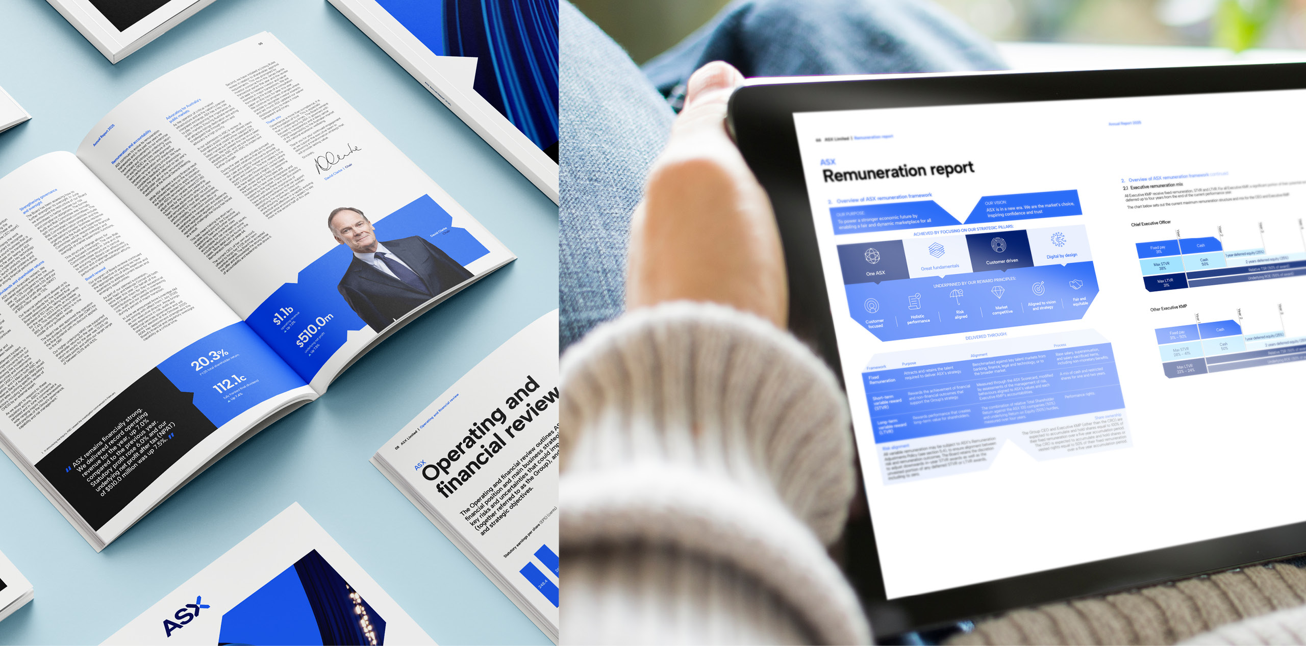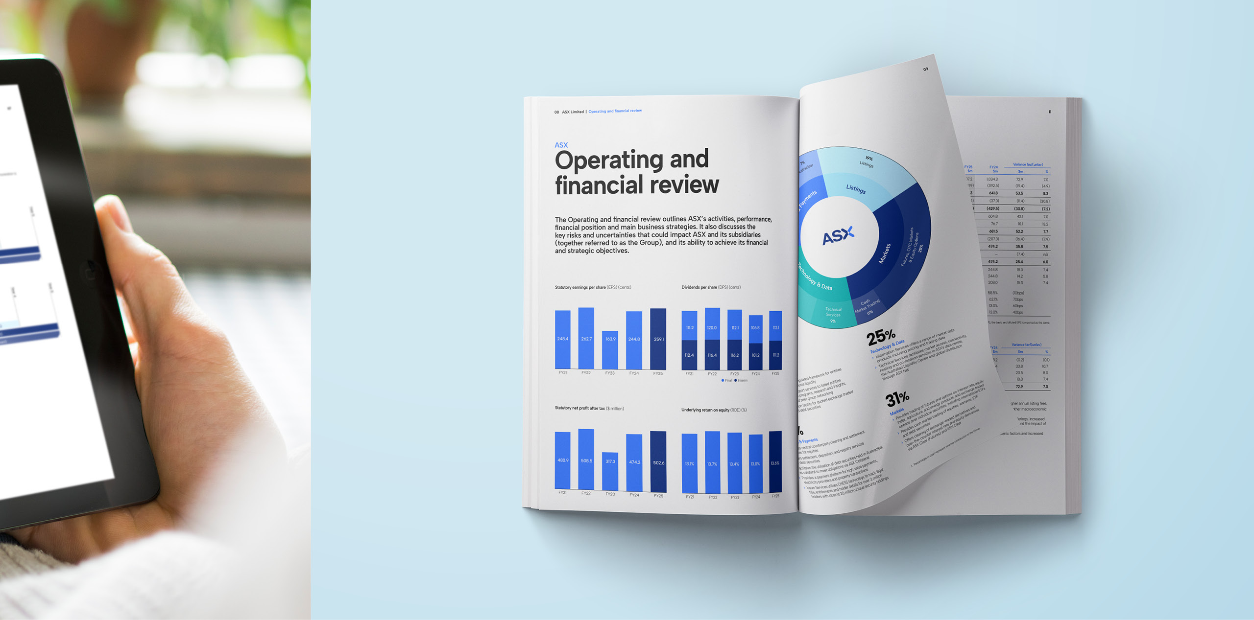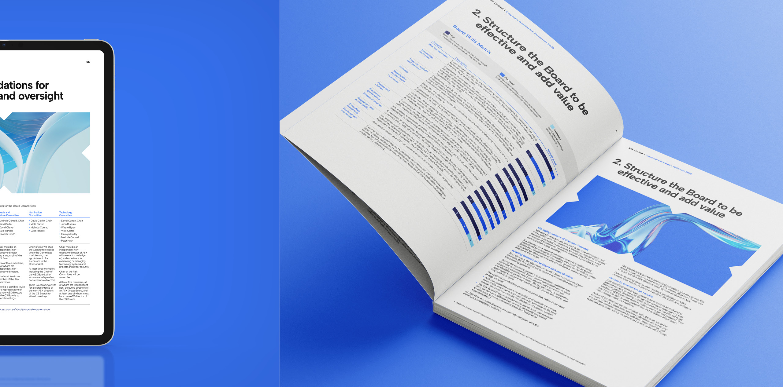 The 2025 Annual Reporting Suite was among the first opportunities to showcase ASX’s refreshed brand, launched only weeks earlier. Introducing the new identity across a flagship corporate document set a clear benchmark for consistency and impact. Our collaboration with ASX focused on leveraging the Workiva platform to deliver a seamless, highly collaborative reporting process. By working closely with their team, we ensured the brand was applied with precision and clarity, reinforcing ASX’s forward momentum and strategic vision.